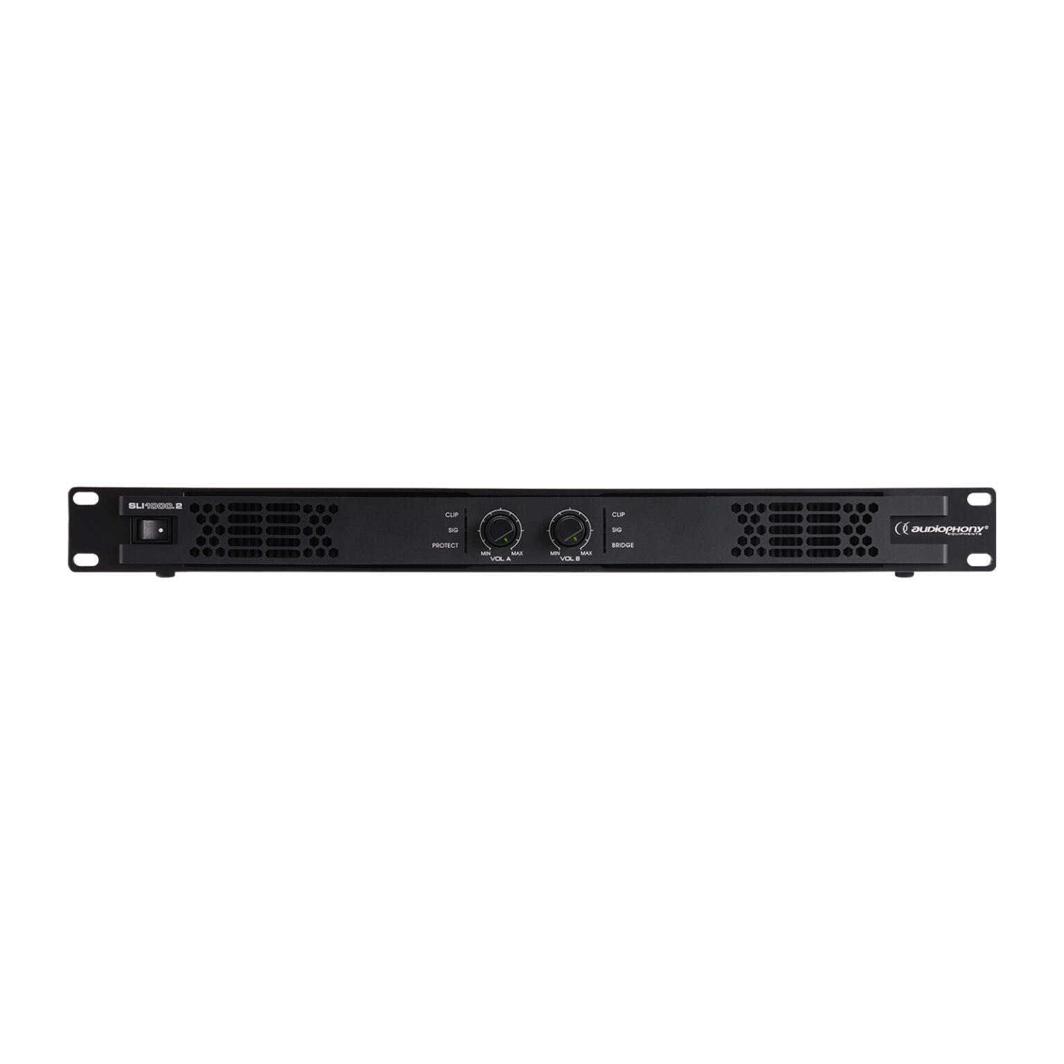 Audiophony SLI1000.2 – amplificator profesional stereo Class D cu până la 2×900 W RMS la 4Ω și 1000 W în 100 V, conexiuni combo/speakON, LED-uri și multiple moduri de operare pentru sonorizări PA și instalații audio profesionale.
