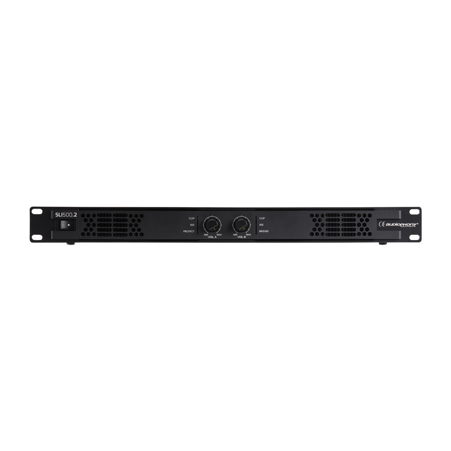 Audiophony SLI500.2 – amplificator profesional Class D stereo cu până la 2×450 W RMS la 4Ω și 500 W în mod 100 V, conexiuni combo/speakON/XLR, LED-uri semnal/clip/protecție și moduri multiple de operare pentru PA și instalații audio.