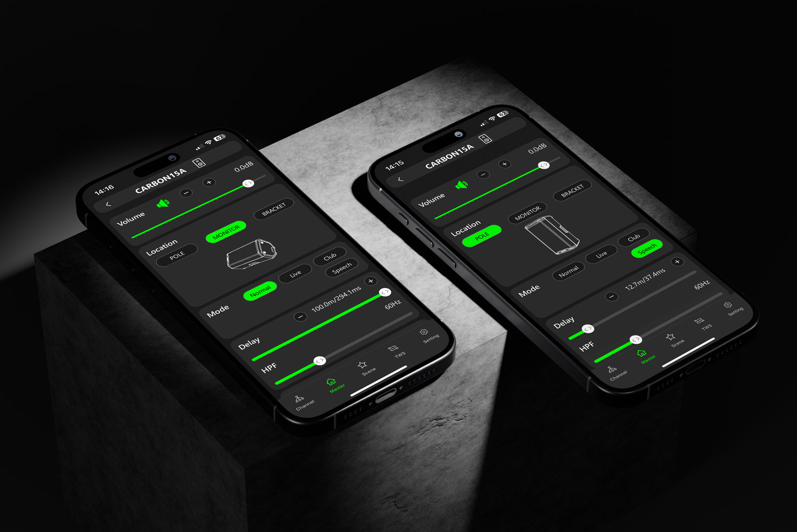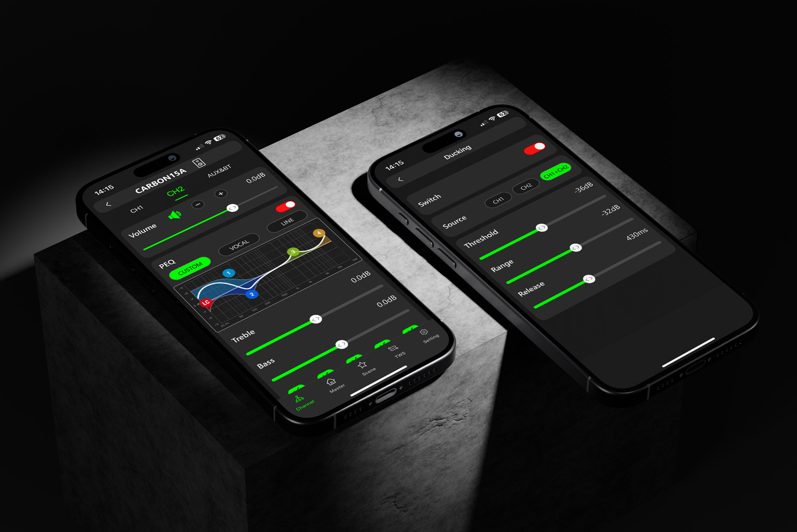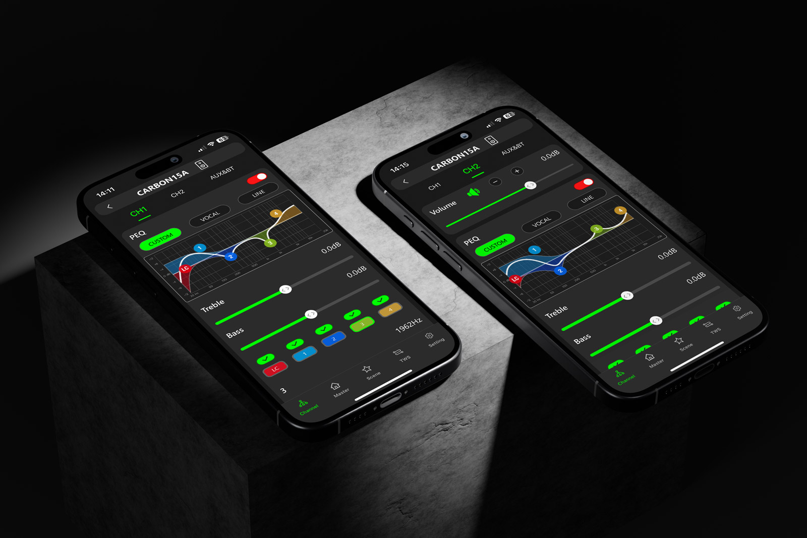 Incintă acustică activă 12″ + 1,35″, 1500W RMS, SPL 130 dB, DSP cu afișaj, Bluetooth TWS, control din aplicația mobilă CARBONcontrol